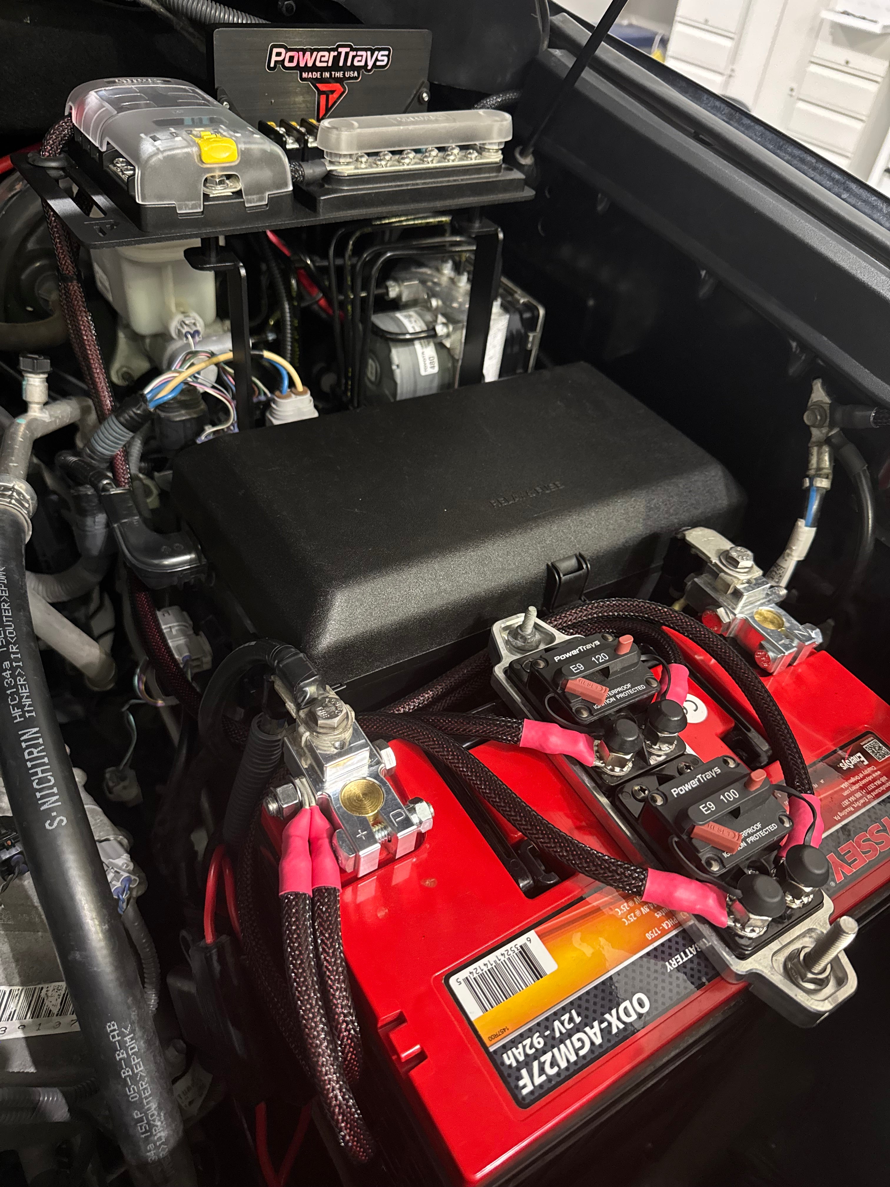 2. Dual CB Option: This option utilizes 2 circuit breakers as opposed to the terminal mount MRBF's. Circuit breakers provide the same protection as the MRBF's, with the added benefit of being resettable if the current exceeds the max rating. These circuit breakers also have a manual trip button to cut power to the system for when you’re working on it and wiring up new accessories. Note: The circuit breakers can be mounted to the top of your factory fuse block cover with 3M double sided VHB tape if you don't want to drill any holes.
